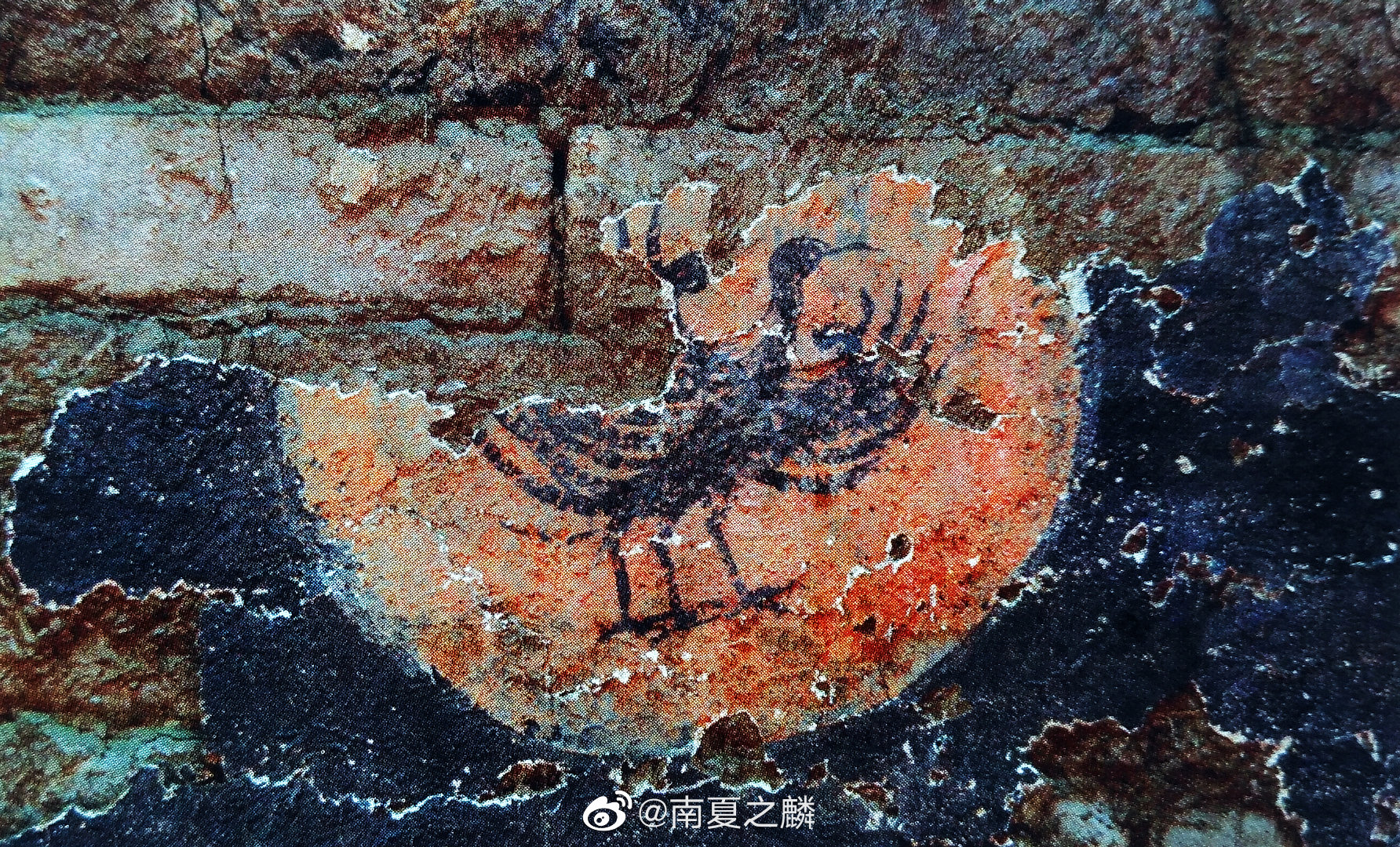 图11、12:墓室东西顶部所绘的日月,合于墓志所言“上悬乌兔”。日中金乌已凤凰华,月中绘桂树及捣药玉兔,又以弧线绘出月牙,也是唐时特色。